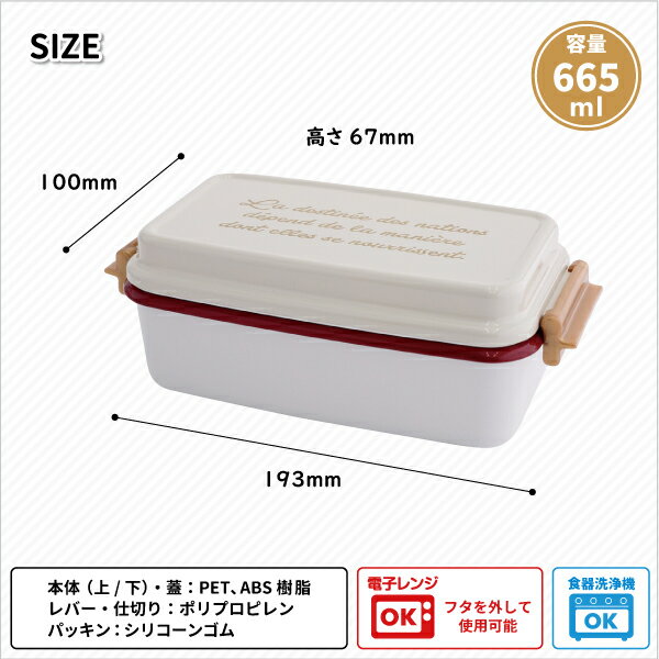 商品名 商品名 :マチュリテエナメル 2段ランチ ≪3色≫ *ベージュ *レッド *ネイビー サイズ 19.3x10x6.7cm 容量:上段:300ml 下段:365ml 素材 本体・フタ・上段:PET・ABS樹脂、ウレタン塗装 (耐熱温度:140℃) 留め具:ポリプロピレン (耐熱温度:140℃) パッキン:シリコーンゴム (耐熱温度:140℃) 商品説明 ホーロー風のおしゃれな『マチュリテエナメル』ランチシリーズが登場しました☆